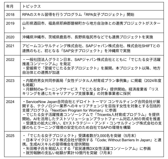 「でじたる女子プロジェクト」は、女性はもちろん、社会のニーズにも応えながら成長を続けてきました。これまでの主なマイルストーンは以下の通りです。